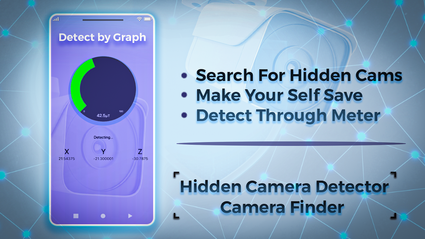 Hidden camera detector app help you to secure your privacy against spy cam and works are anti spy camera for your privacy protection. This app have not only detect hidden spy camera but also find spy microphone, spy video camera, and also transparent spy camera around you.
