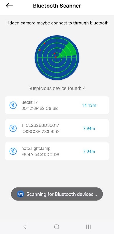 - Bluetooth Scanner – Discover nearby Bluetooth devices. Spot names commonly used in spy hidden camera locator tools or disguised surveillance gear.