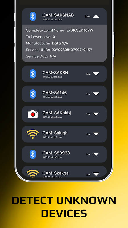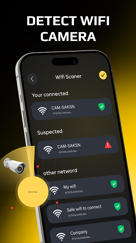 - Detect hidden cameras connecting to strange wifi networks to transmit data.