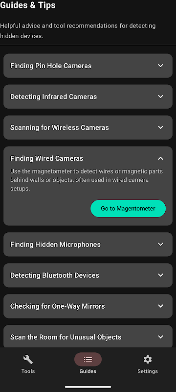 Hidden SpyCam Detector helps you identify potential hidden cameras and suspicious devices in your surroundings. Whether you're staying at a hotel or exploring a new place, this app provides simple to use tools to enhance your privacy and peace of mind.