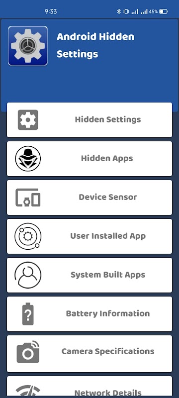 Hidden settings application has more more other function like finding hidden apps in your smartphone, we added a function feature that will find all hidden apps in your smartphone then you can perform any action with our hidden android setting app. with options of hidden apps detection we also provide all sensor information like magnetic sensor, light sensor, smart detection sensor etc. so take advantage of our free application and install it now.