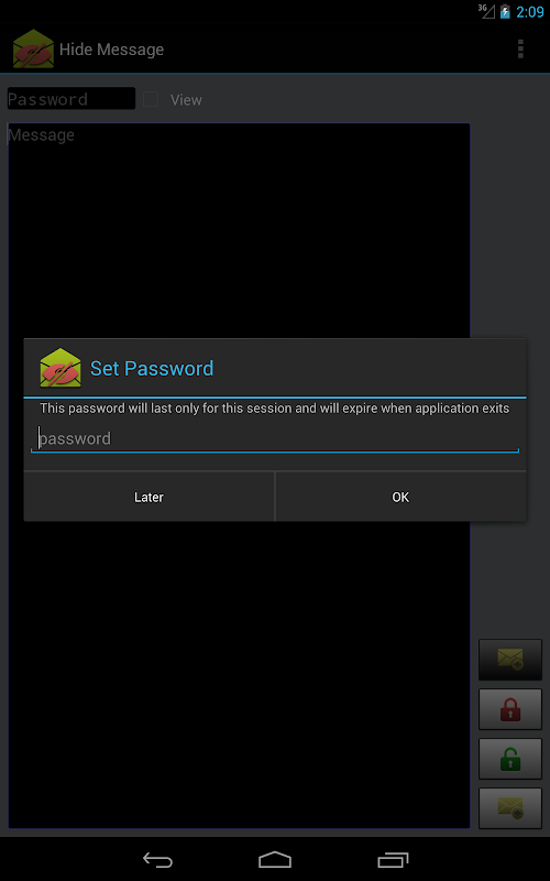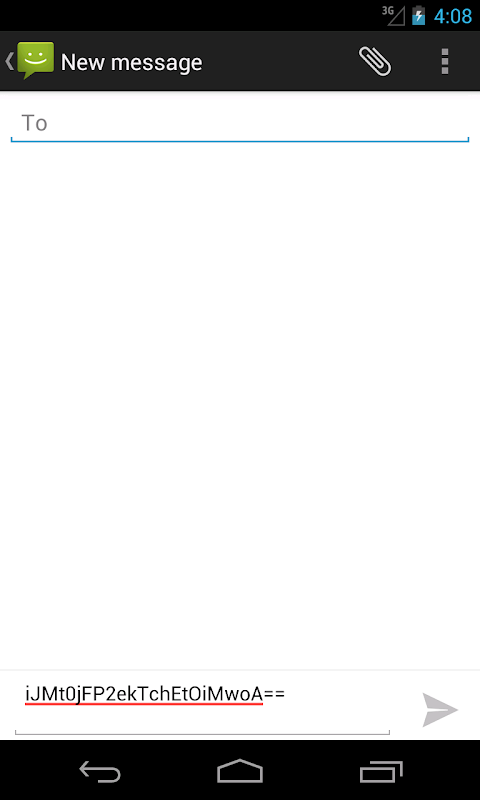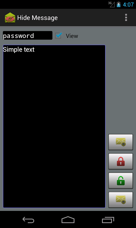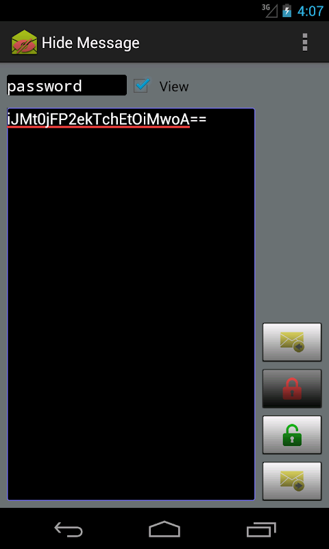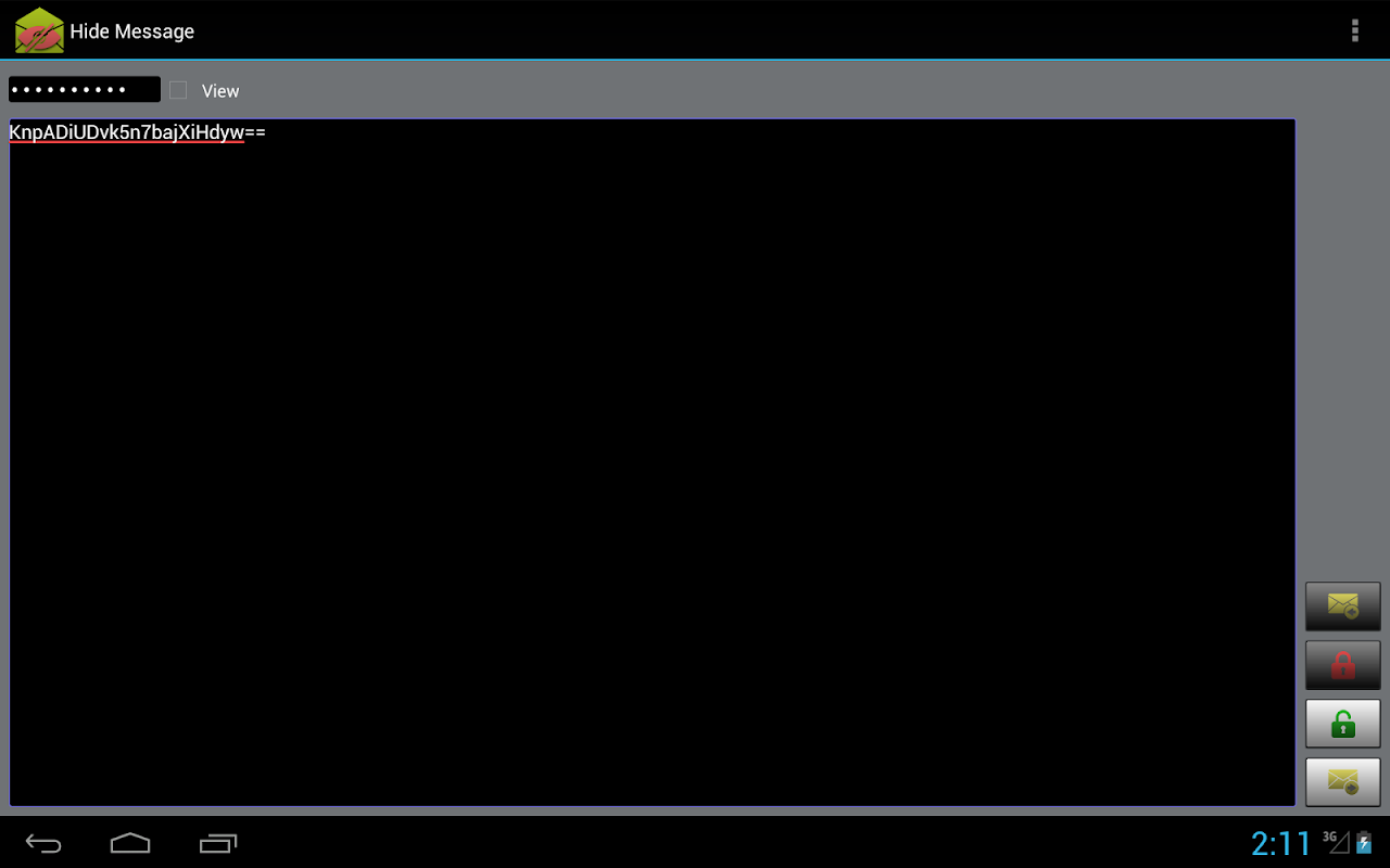 This application gives you the ability to transform sms or any text to non-human-readable format and vise versa, and send it using your favorite chatting application. You can simply write your message using Hide Message, transform it using key and send it. Upon receiving a message, transform the text back to original form using the same key. This application requires a prior key share for both entities.