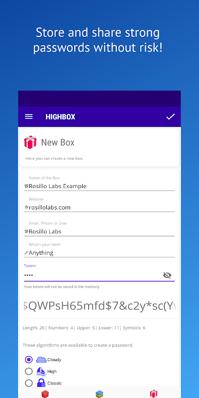 Highbox work through our specialized Hash algorithms that using a Totem and Hint like entries to make a unique password.
