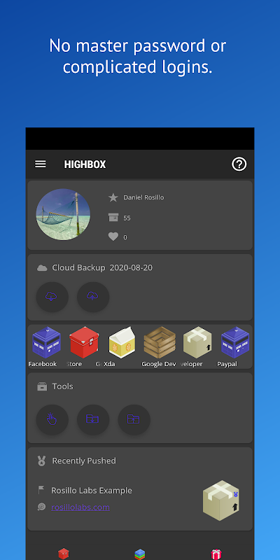 Highbox is a web account manager that makes your passwords for you, the only thing you have to do is create a totem. A totem is a word chosen by you. Your totem is the only thing that you should keep in mind, it could be anything!
