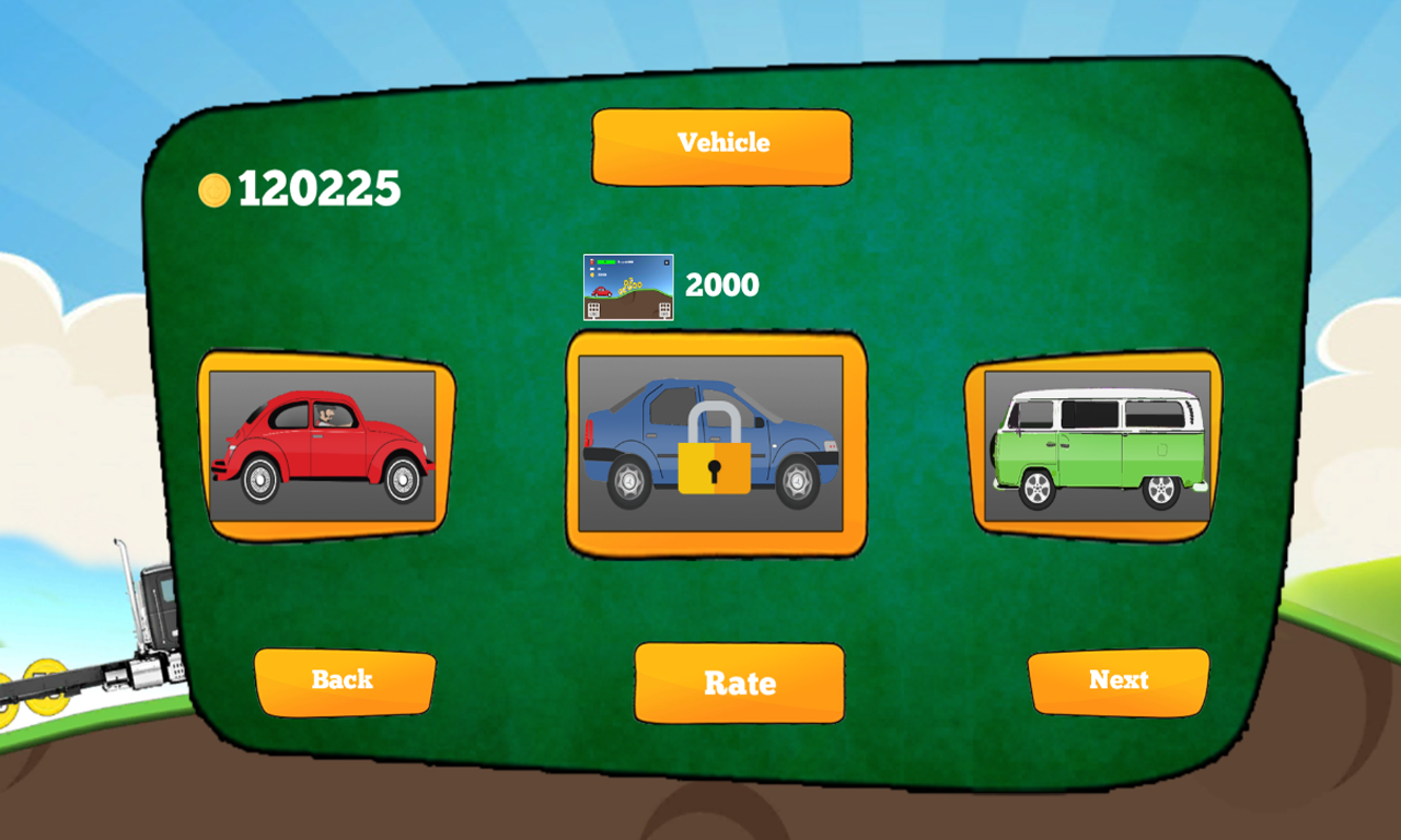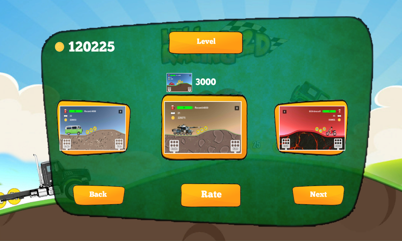 Hill Racing 2D is addictiv racing climb with 2d graphic, select car, track and upgrade your car to start race and collecting the coins.