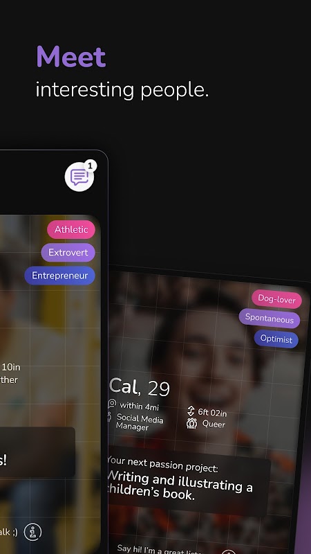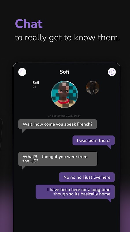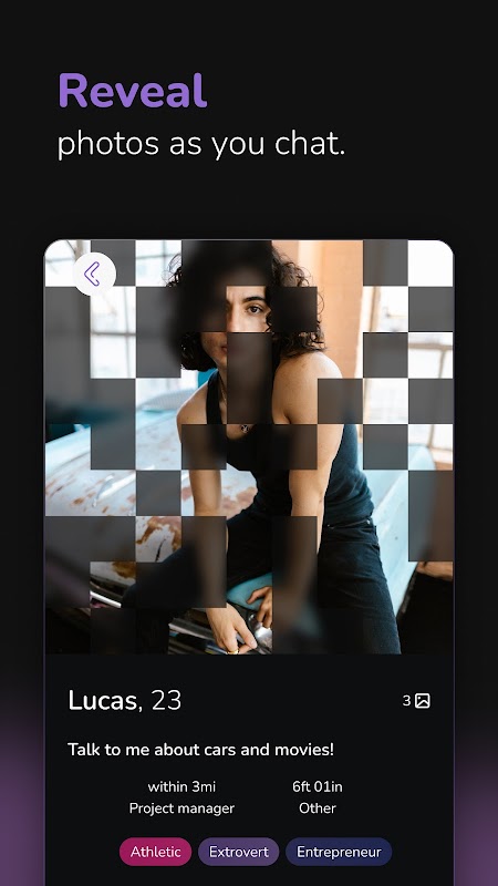 We’re a new way to connect, chat & meet - where personality and interests are valued as much as the physical. Your profile picture appears blurry to all users. With each message exchanged, part of your photo is revealed to your match and vice versa!