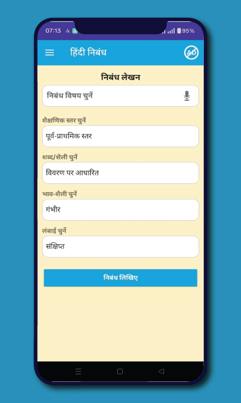 इत्यादी विषय का समावेश किया है! हिंदी निबंध ऍप से आप आर्टीफिसिअल इंटेलिजन्स का इस्तेमाल कर के हर समय नये नये निबंध लिख शकते है ! पत्र लेखन कर शकते है ! वाद विवाद प्रतियोगिता लेखन कर शकते है! भाषण लेख शकते है ! कहाणी लेखन आधी कविता लेखन, कहाणी लेखन,कविता लेखन, हिंदी पाठशाला निबंध, माध्यमिक विद्यालय लेखन / ११और १२ कक्षा निबंध लेखन, हिंदी मुहावरे इत्यादी समाविष्ट है ! आपकी पढ़ाई को और असण करणे केलीये ऍप डाउनलोड करे और एके दोस्तो के साथ शेयर करे !