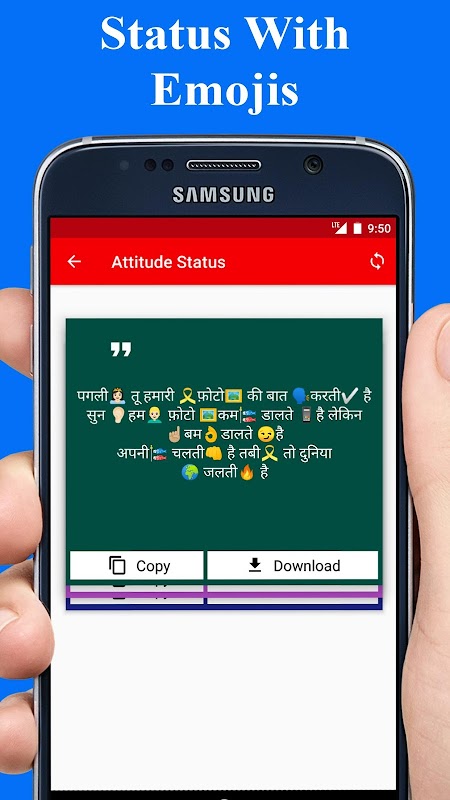 This app brings you the best status collection of 2024 in English & Hindi. Show your attitude & personality with these attitude status in Hindi, Hindi sad status, motivational quotes, love quotes, Dosti status, Hindi funny status, status on life, sarcasm status and more from our collection of best status in English and Hindi. Collection of best status and quotes in Hindi & English which can be used as a WhatsApp status, Facebook status, Instagram captions or on any other social media.