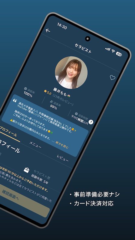 Search for a therapist by selecting time, location, and menu. The therapists closest to your criteria will be displayed in order.