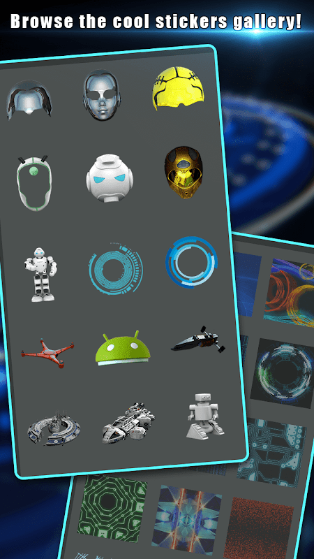 Pick a robot frame to make hacker photos! Turn on the fake hero vision filters for selfies. An amazing AR camera virtual hologram frame will look amazing on your portraits! If you like holograms, you will love our robot stickers! Make your own hologram images with a high tech photo frame, an AR camera effect and an AI photo effect! Find your favorite sci fi filter in this hologram image maker app completely free of charge! Create fictional worlds in this fantasy maker! Let your dreams and nightmares come through! Add stickers to pictures in a tap! It's great for insta pics!