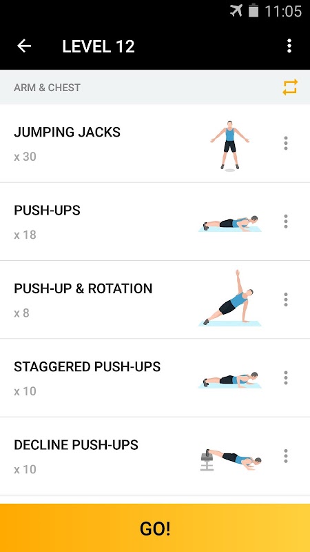 The app provides daily workout routines for different muscle groups. Workouts for each body part are designed into 21 levels. You can customize your workout routines under each level.