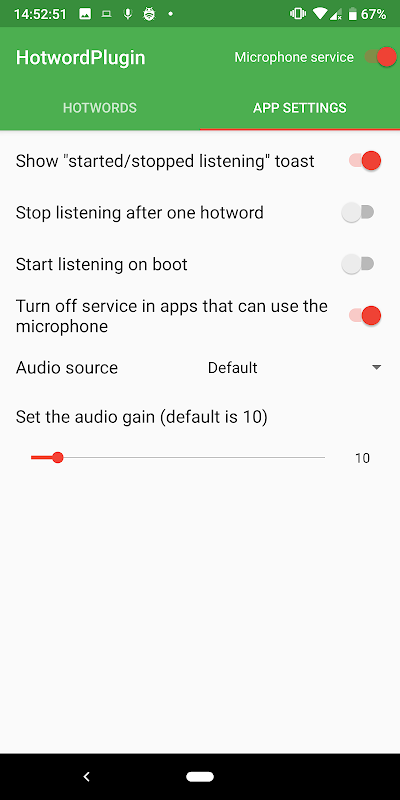 To give you a taste of what's possible I already give you a few hotwords to play with, but since they are not trained to your phone's mic it's much advisable to train and download your own.