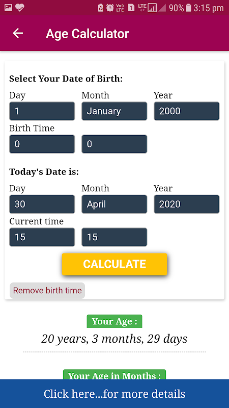 If you have question like, How to age calculation? in your mind. Then this app will answer all your question. This app will help you calculating your age in terms of years, months, weeks, days, hours, minutes and even in seconds. Various information regarding your age is displayed as following: