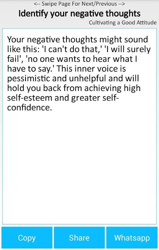 [4] Your negative thoughts might sound like this: "I can't do that," "I will surely fail", "no one wants to hear what I have to say." This inner voice is pessimistic and unhelpful and will hold you back from achieving high self-esteem and greater self-confidence.