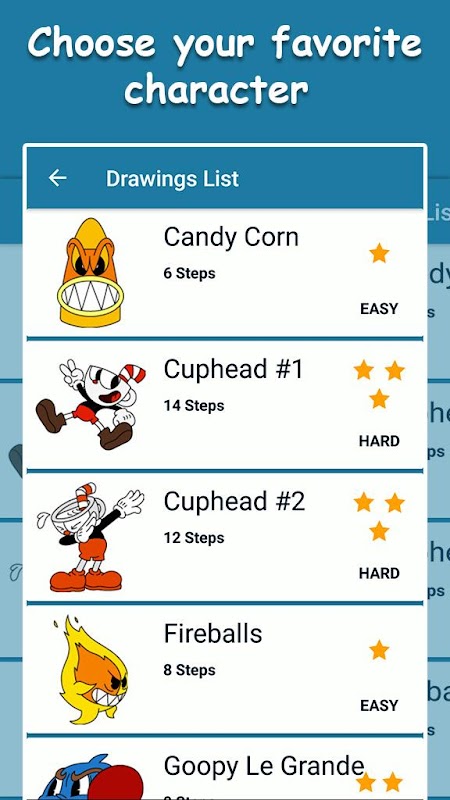 learn how to draw Cuphead Characters step by step easy is a really easy to use application you have a simple menu whose you can share, rate and see more how to draw apps to get more drawing ideas and there are many of easy things to draw that are a simple drawings maybe you can find your favorite character in here, and from this same menu you can click the start draw button then you have a list of cute drawings that you can find many drawing ideas for each character you can see the number of steps and a level of difficulty. choose your level and click to reach all the steps to follow to get a nice and simple drawings of your favorite character, have fun to draw.