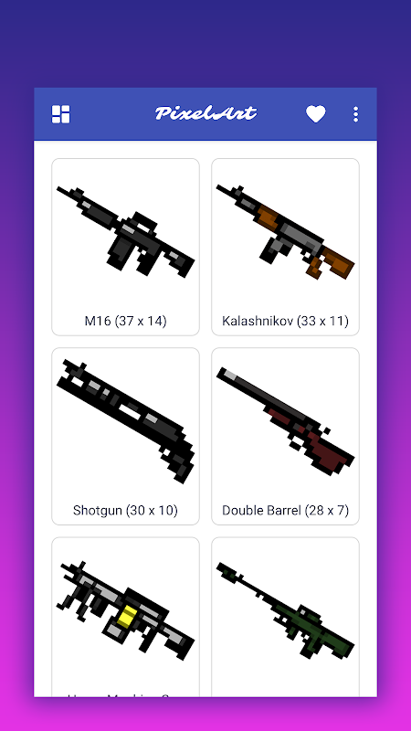 All pixel images are absolutely free. They are available immediately after installing the application. Just install the app, choose any pixel weapon you like and draw.