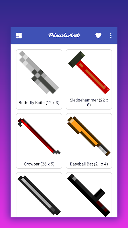 If you want to learn how to draw cool pixel art so that others envy you, then this app is for you. The images are very simple and show which cells to color in. The application contains a huge collection of pixel game weapons. The result will pleasantly surprise you.