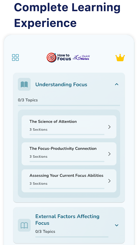 • Complete Offline Access: Learn focus techniques anytime, anywhere without an internet connection.