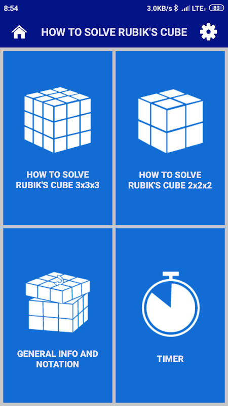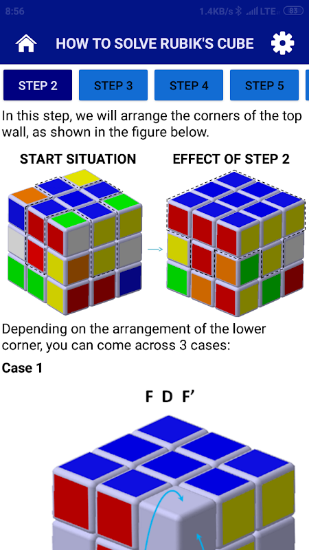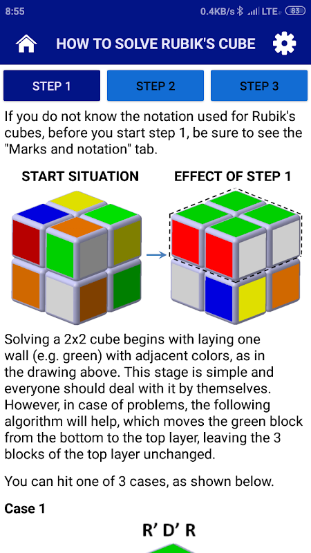 The application shows how to solve cube 3x3x3 and 2x2x2 in few easy steps.