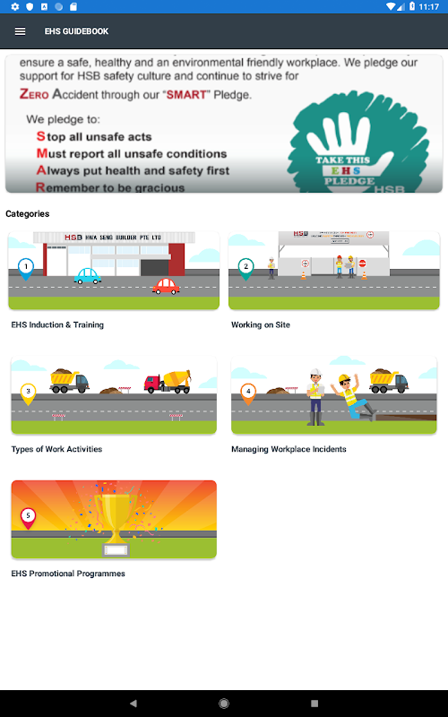 HSB EHS Guidebook Application is an educational and interactive app that has been customised to provide EHS knowledge and training for the employees of Hwa Seng Builder Pte Ltd