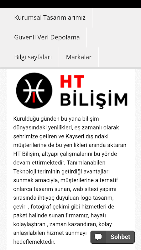 Kurulduğu günden bu yana bilişim dünyasındaki yenilikleri, eş zamanlı olarak şehrimize getiren ve Kayseri dışındaki müşterilerine de bu yenilikleri anında aktaran HT Bilişim, altyapı çalışmalarını bu yönde devam ettirmektedir. Tanımlanabilen Teknoloji teriminin getirdiği avantajları sunmak amacıyla, müşterilerine alternatif onlarca tasarım sunan, web sitesi yapımı sırasında ihtiyaç duyuluan logo tasarım, çeviri , fotoğraf çekimi gibi hizmetleri de paket halinde sunan firmamız, hayatı kolaylaştıran , zaman kazandıran, kolay anlaşılabilen hizmet sunmayı hedeflemektedir.