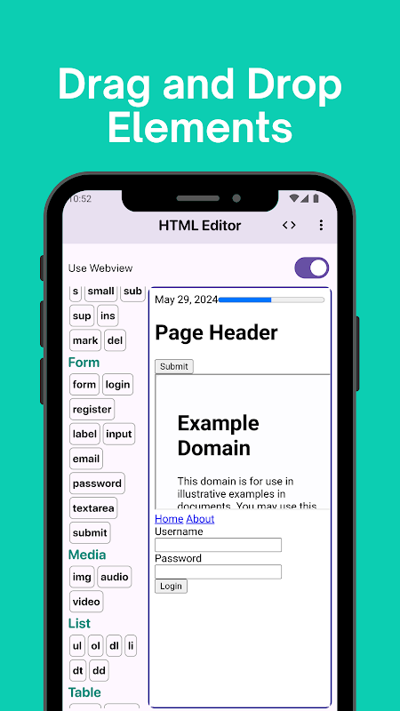 Introducing 'HTML Editor with Drag and Drop,' the ultimate tool for crafting stunning HTML effortlessly! 🌐🖱️ Seamlessly drag and drop elements onto your canvas, creating beautiful and functional web pages with ease. 🖋️✨ Perfect for both beginners and experienced developers, our intuitive interface allows you to focus on creativity without the hassle of coding from scratch. 🚀💻 Customize your designs, preview changes in real-time, and streamline your workflow. Whether you're building a portfolio, a blog, or a full-fledged website, 'HTML Editor with Drag and Drop' is your go-to companion for web development excellence! 🌟👩💻👨💻.