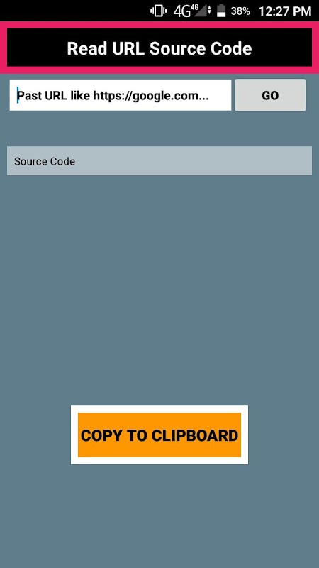 This application created by hyper studios and this work is read URL source code HTML code and user can copy source code easily only two steps first step enter your URL second step press go button now you can see website source code and copy to clipboard so easily.