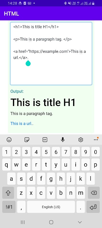 On this HTML editor app, you just have to insert the HTML tag inside of the code area. As soon as you start typing HTML, this app will automatically return the output quickly.