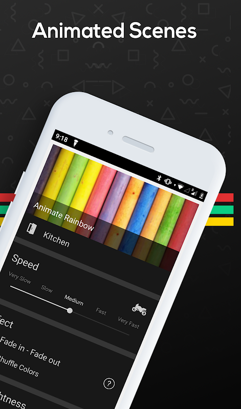 - Preset and custom scenes, 800+ color palettes, with scene shuffle options