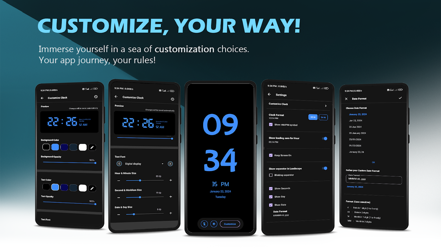 🎨 Endless Customization: Express your individuality and style with our extensive customization options. Choose from a vast array of fonts, text size, themes, and clock formats to create a personalized timepiece that reflects your personality. Whether you prefer a sleek modern design or a retro-inspired look, the possibilities are endless.