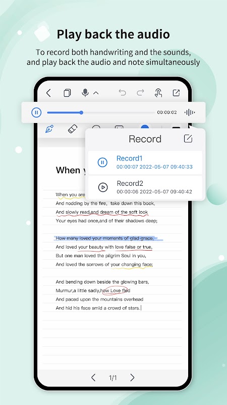 - Make a recording while simultaneously writing on a notebook in Huion Note. Tap a certain word or mark in the note, and the audio will jump to the corresponding point.