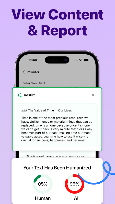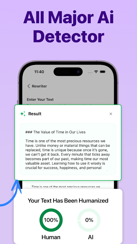 Paste your text, tap rewrite, and receive humanized content in seconds. The humanizer app is designed with a clean interface so you can focus on writing—not settings.
