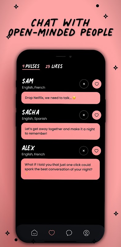 It all starts with your anonymous profile. Express yourself freely about your desires, or simply about what makes you tick. Find people who share your interests and dive into passionate discussions. Be creative and authentic, it's always what attracts the most!