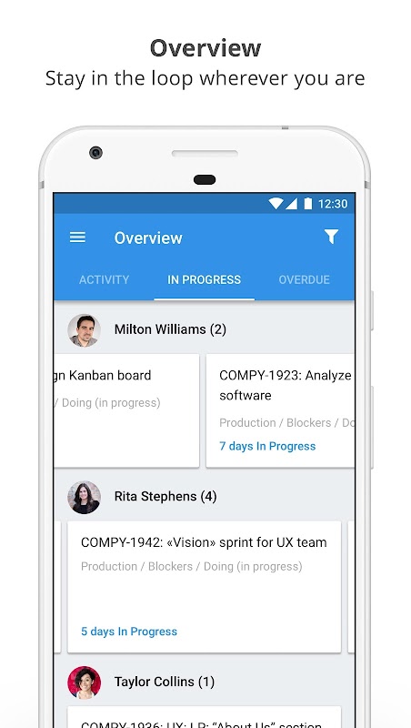 - Keep an eye on project performance: get a complete overview of tasks in progress, overdue tasks and employees' work logs.