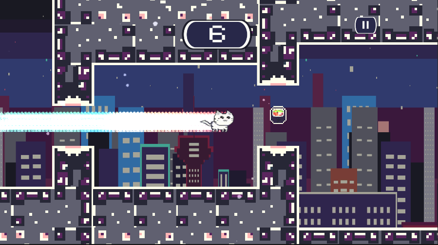 Help cat friend to collect food while flying over the city.