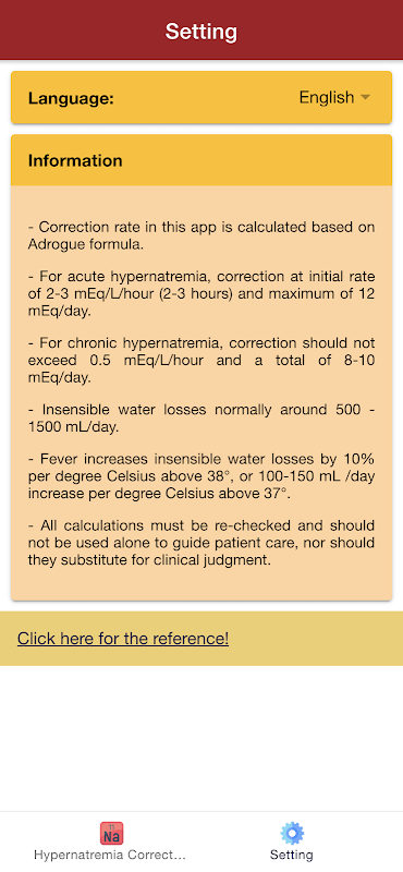 Disclaimer: all calculations must be re-checked and should not be used alone to guide patient care, nor should they substitute for clinical judgment. Calculations in this "Hypernatremia Correction Rate: Sodium Tracker" app might be different with your local practice. Consult to expert doctor whenever necessary.