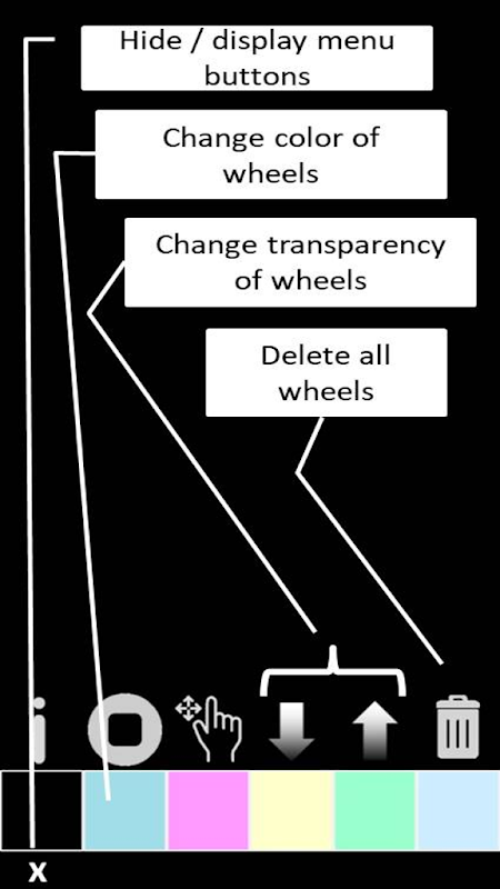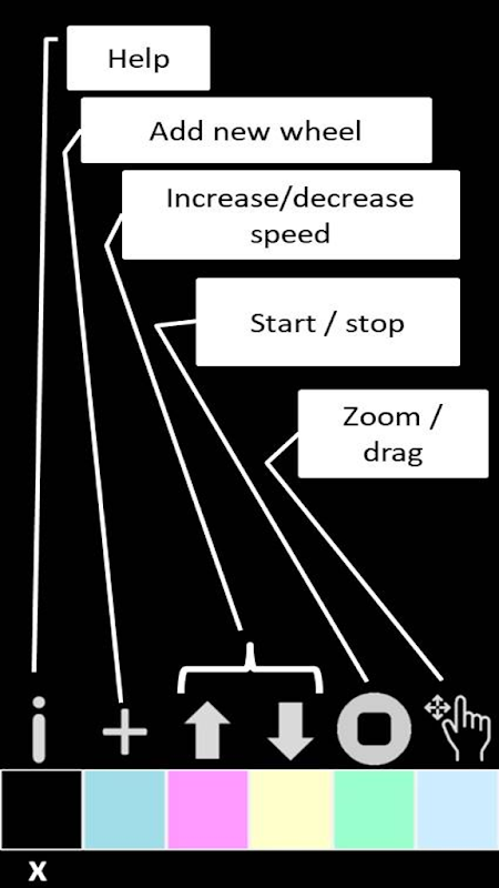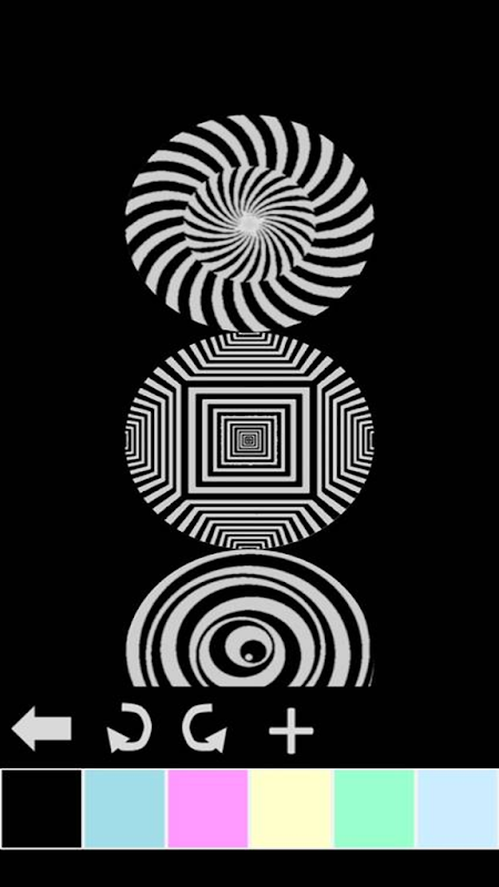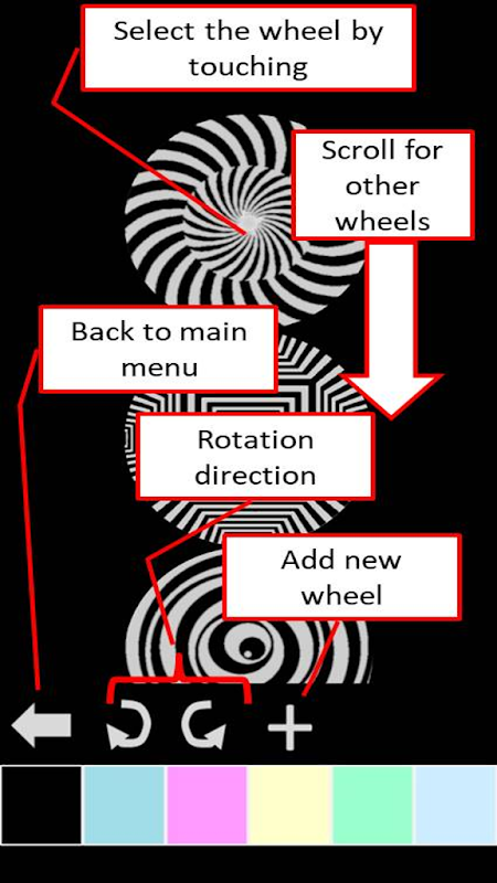 In this application there is a library including many hypnotizing wheels. You can add them on the screen, rotate them, change colors of them.