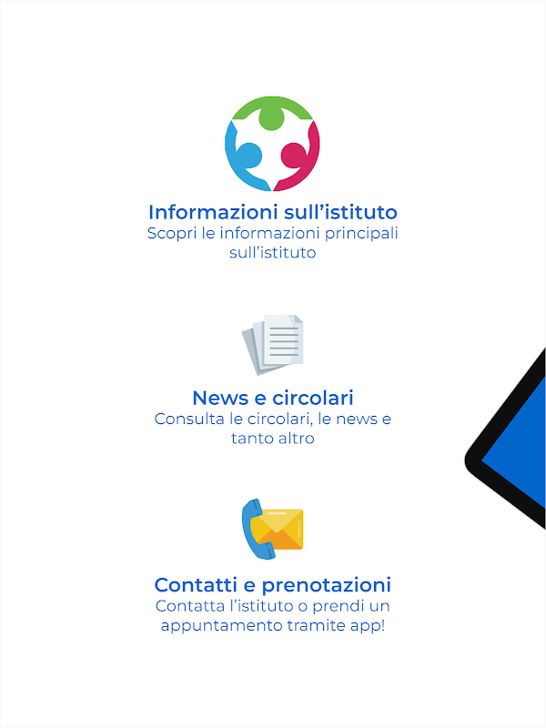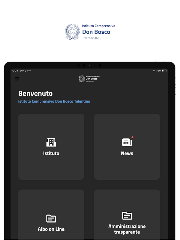 Discover the app of the Don Bosco Comprehensive Institute of Tolentino. You will be able to view all the institute's information and contacts, consult the contents, receive push notifications based on your role and interests, access the digital desk and book an appointment with the secretariat or presidency.