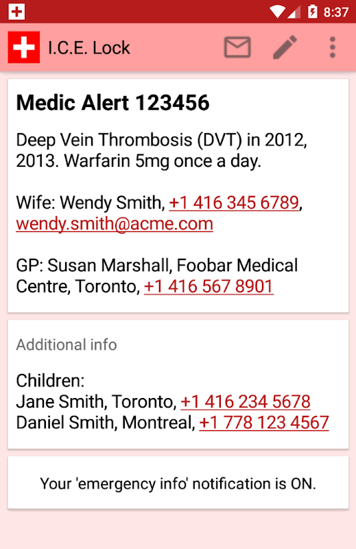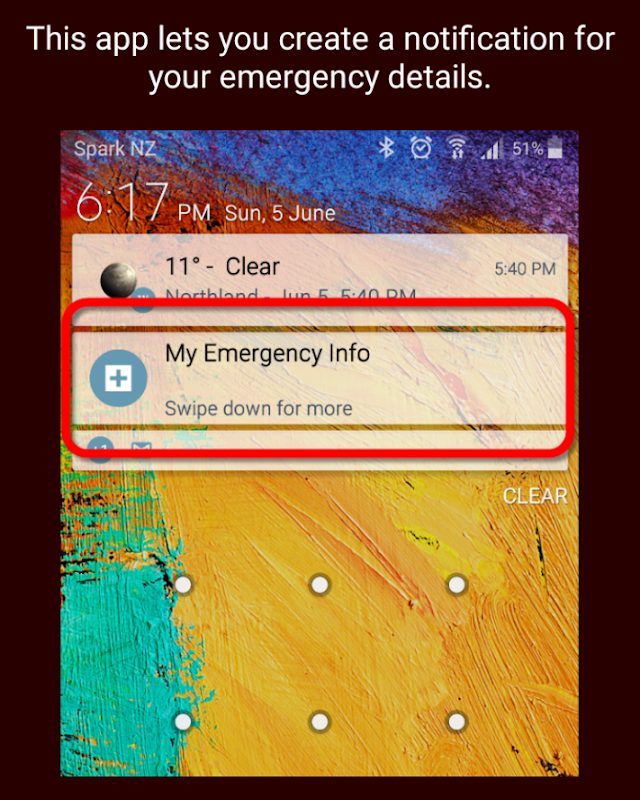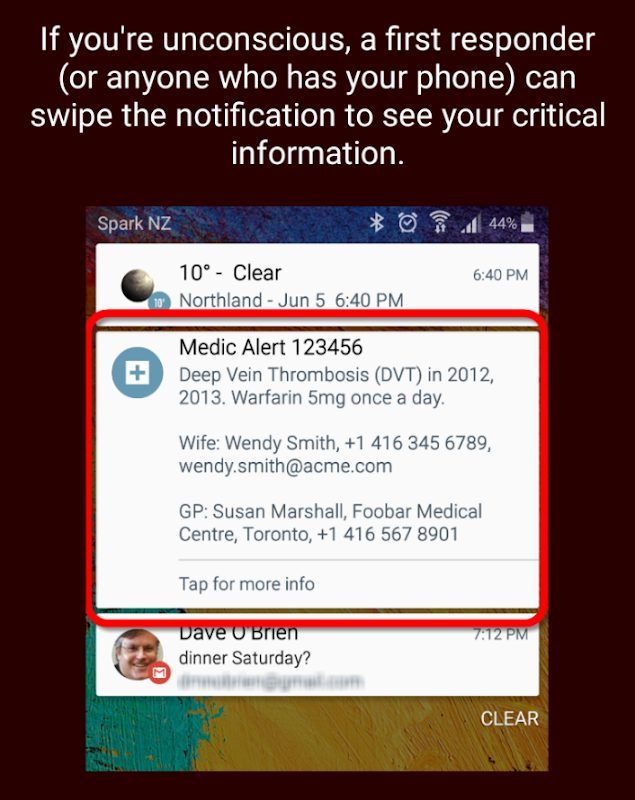 If someone swipes down, your emergency details are shown - a large headline and up to 6 or 7 lines of smaller text. If your phone is locked, that's all they can see. If your phone is unlocked, they can tap for more information that you control.