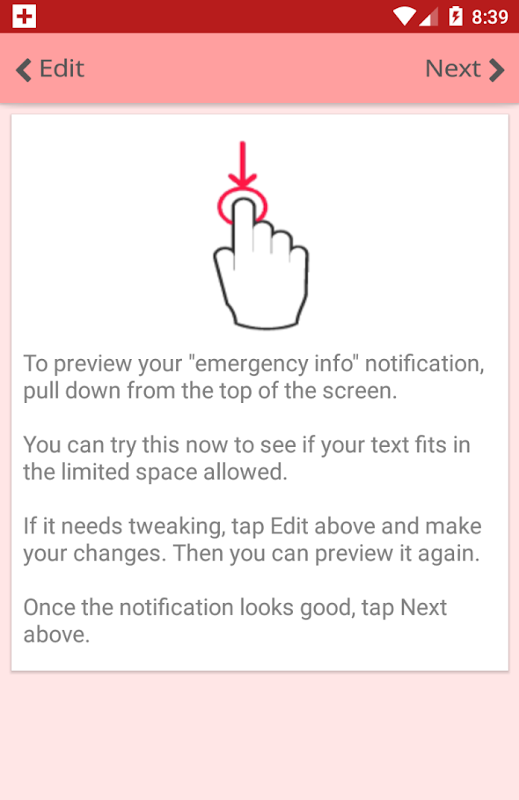Until you touch it, the notification simply shows "My Emergency Info - swipe down for more".