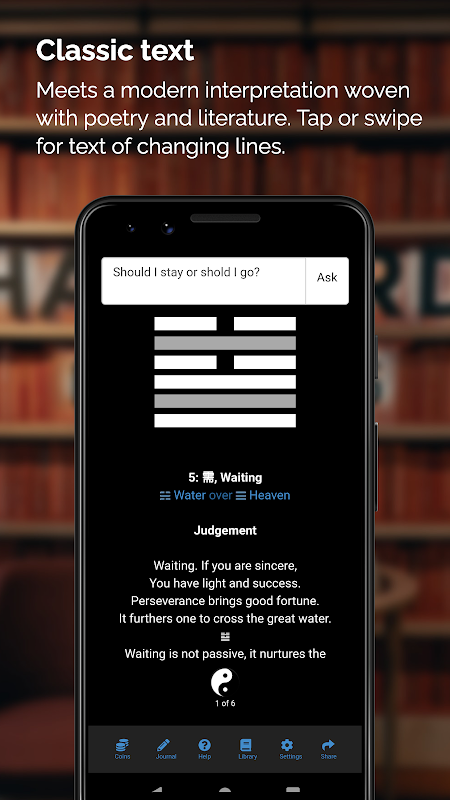 • 📚 Hexagram Library: Browse all 64 hexagrams and every changing line — by number, trigram, image, or text