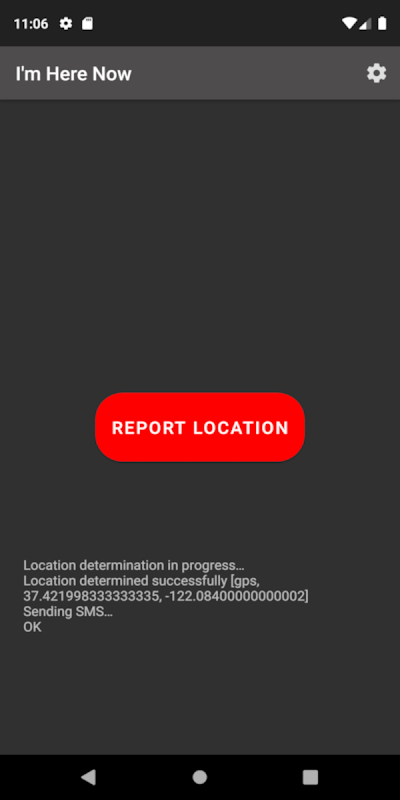 I'm Here Now will quickly determine your location and send your coordinates via SMS to the number you specified. No internet connection required. Is One Button.