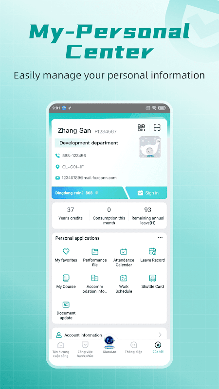 5、 Me: Display of employee personal information inquiry, credits, annual leave, personal applications, account information, general settings, and other functions.