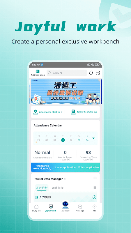 2、 Joyful Work: Create a personal exclusive workbench for employees to view daily work information, including daily attendance checks, viewing schedule information, etc., including commonly used applications, pocket managers, workbenches, and other modules