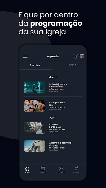 Resources available in the Application: News, Church Agenda, Events, Contents, Projects, Live Transmission and Teaching Module.
