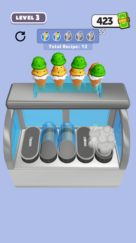 Strategize your moves carefully! With limited spaces to maneuver and an increasing complexity of patterns, each level is a unique brain teaser. The key to success? Plan your moves to minimize taps and maximize efficiency. When you line up identical flavors, watch them instantly leap into cones, satisfying both your strategy and virtual sweet tooth!