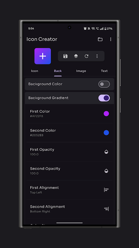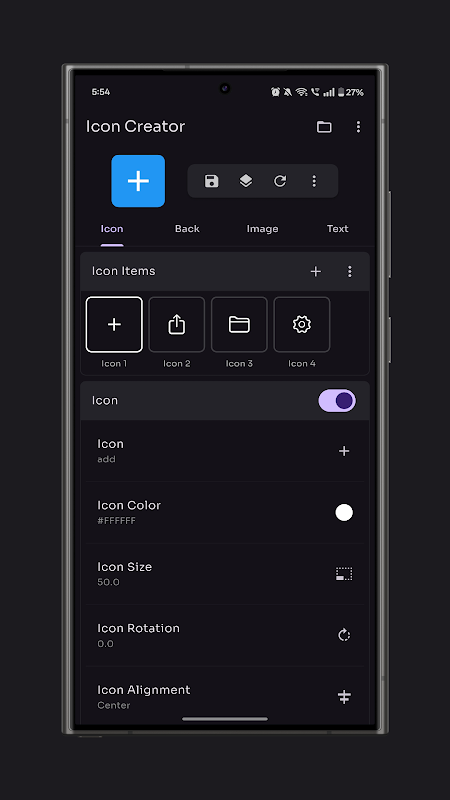 Icon Creator is a comprehensive tool designed to simplify the process of creating icons and logos. With an extensive library of icons, intuitive search functionality, and a range of customization options, users can easily tailor their designs to suit their needs. Modify properties such as alignment, position, rotation, opacity, size, and color, with additional features including icon shadows, backgrounds, and borders. Users can also leverage background color customization, gradients, and images, alongside options for border shapes and styles. Incorporate images from the gallery with customizable fit, filters, and borders, or add text with font selection, weight, style, spacing, and shadow effects. The app supports layering of icons, images, and text, with the ability to adjust layer order and even pick colors from existing images or invert them.