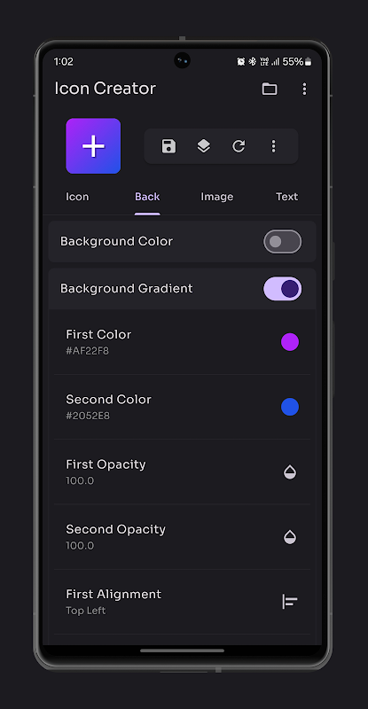 Icon Creator is a comprehensive tool designed to simplify the process of creating icons and logos. With an extensive library of icons, intuitive search functionality, and a range of customization options, users can easily tailor their designs to suit their needs. Modify properties such as alignment, position, rotation, opacity, size, and color, with additional features including icon shadows, backgrounds, and borders. Users can also leverage background color customization, gradients, and images, alongside options for border shapes and styles. Incorporate images from the gallery with customizable fit, filters, and borders, or add text with font selection, weight, style, spacing, and shadow effects. The app supports layering of icons, images, and text, with the ability to adjust layer order and even pick colors from existing images or invert them.