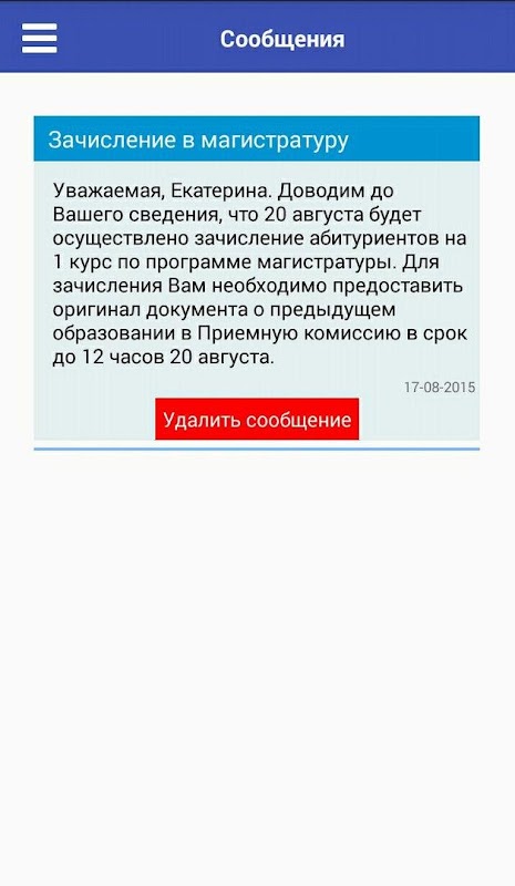Приложение обеспечивает получение персонализированных сообщений от Приемной комиссии о ходе приемной кампании.