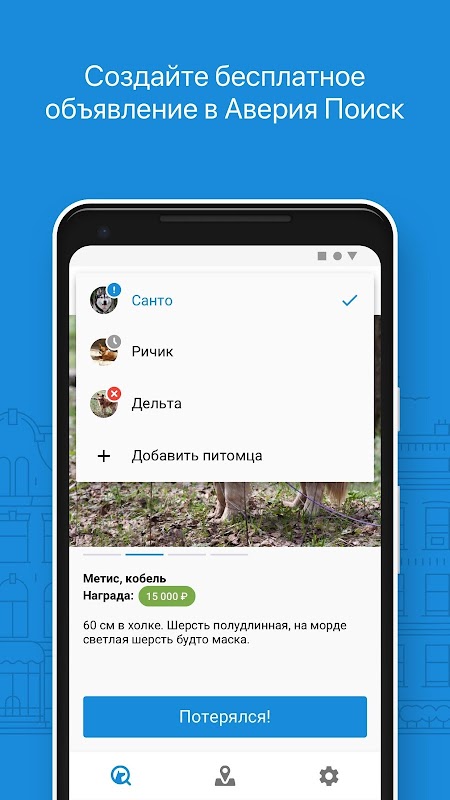Создайте бесплатное объявление в сервисе Аверия.Поиск. В случае пропажи вашего питомца, мы сразу разместим его в популярных социальных сетях и в нашем бесплатном приложении.